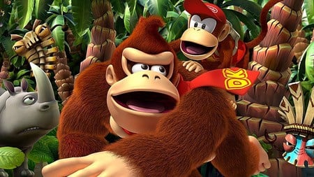 Help Donkey Kong and Diddy Kong recover their precious banana hoard from the villainous Tiki Tak Tribe in Donkey Kong Country Returns HD for Nintendo Switch! Stomp enemies, blast through barrels, and ride rockets and mine carts (and even Rambi the rhino) in 80 levels across nine worlds.