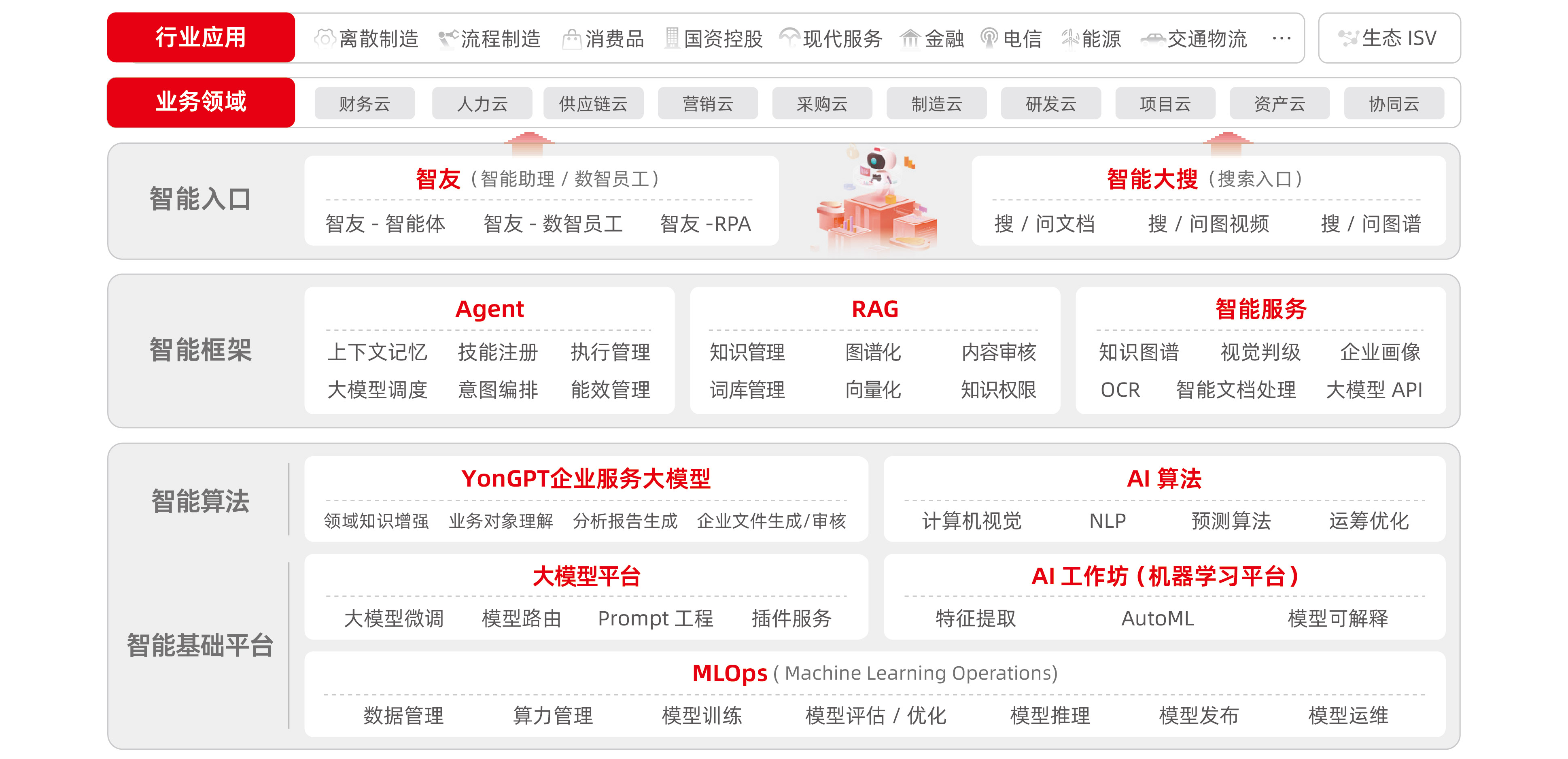 YonGPT 用友企业服务大模型是业界首个企业服务大模型,可以为企业提供智能化的人机协作、业务洞察、商业决策支持和智能运营服务,是深懂企业服务的垂类大模型。