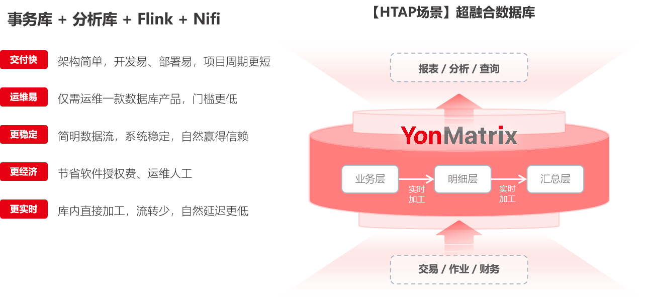 通过整合事务处理与分析处理,超融合数据库助力企业实现数据的实时分析与高效事务处理,满足复杂业务需求,具备交付快、运维易、更稳定、更经济、更实时的优势。