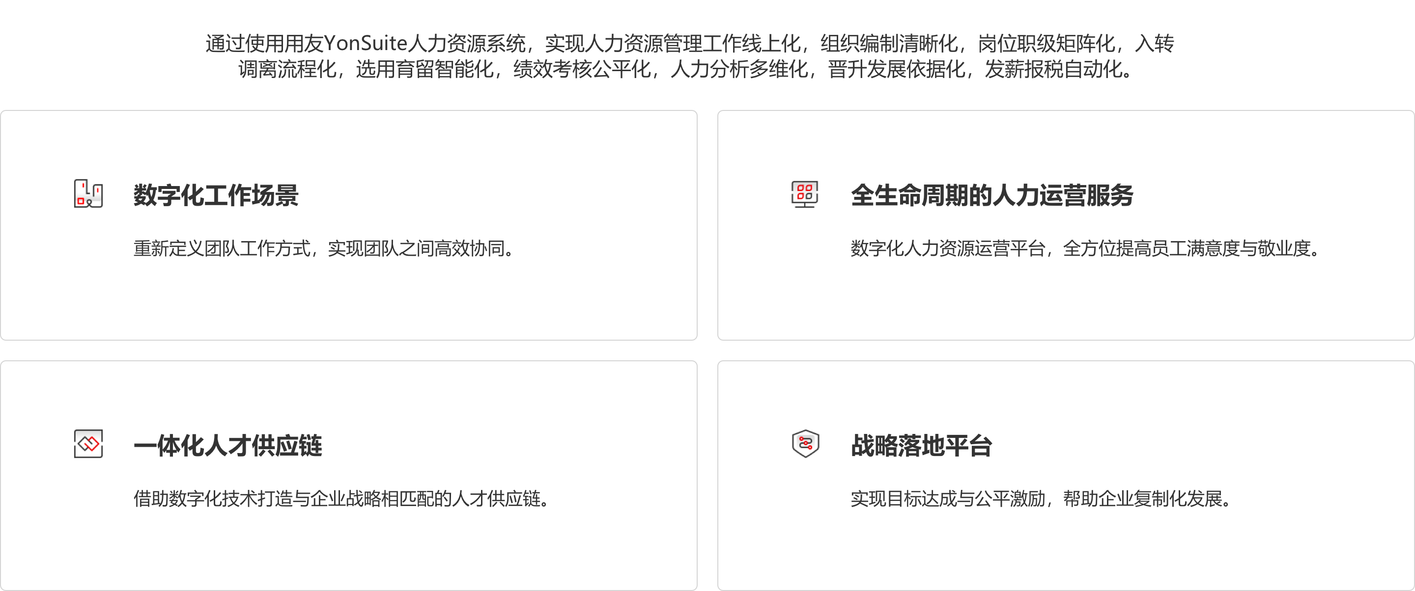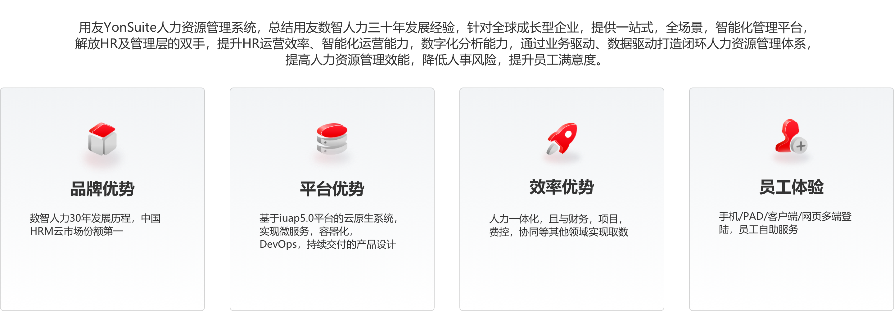 用友人力资源管理融合了先进的管理理念和实践,为国内外成长型集团企业及各类组织提供全生命周期人力资源管理解决方案,包括面向多组织集团的人力资源集团管控、核心人力资源管理、基于流程的精细化劳动力管理、以及目标绩效、招聘培训、组织发展为核心的人才管理。